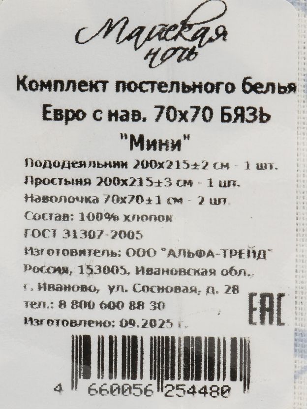 • Универсальный размер евро: простыня и пододеяльник 200х215 см, 2 наволочки 70х70 см — подходит для большинства кроватей.