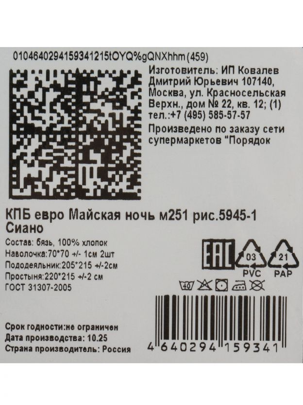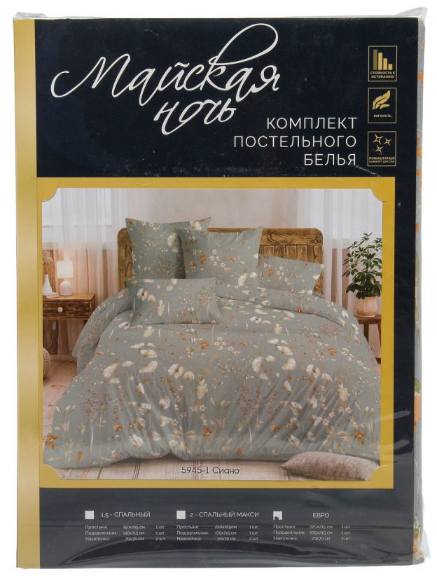 • Евро-комплект: простыня 215х220 см, пододеяльник 205х215 см, две наволочки 70х70 см — подходит для большинства кроватей.
