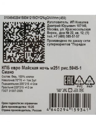 Постельное белье евро, простыня 215х220 см, 2 наволочки 70х70 см, пододеяльник 205х215 см, Майская ночь, бязь, Сиано
