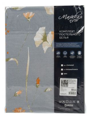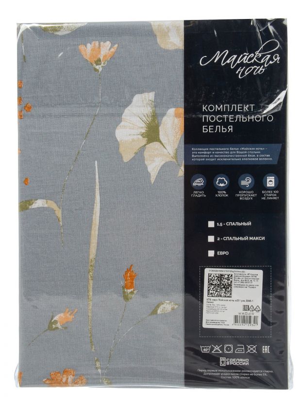Постельное белье евро «Майская ночь» (Сиано): натуральная бязь, стильный серый дизайн, упаковка для подарка — комфорт и уют для вашей спальни.