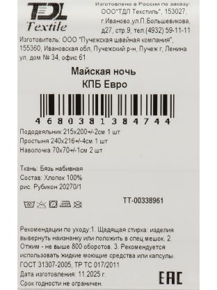 Комплект евро включает простыню 216х240 см, пододеяльник 200х215 см, две наволочки 70х70 см. Простыня без резинки, пододеяльник без застежки.