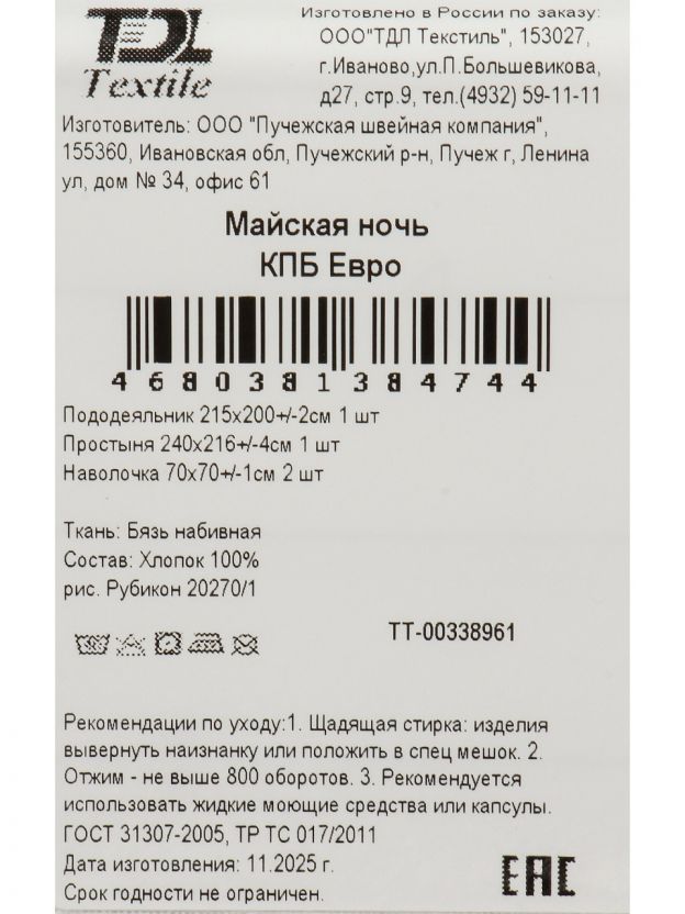 • Универсальный размер евро: простыня 216х240 см, пододеяльник 200х215 см, две наволочки 70х70 см — подходит для большинства стандартных кроватей.