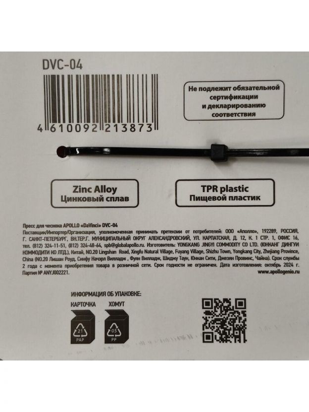 Приобретая пресс для чеснока Apollo DaVinci, вы получаете высококачественный продукт, который станет незаменимым помощником на вашей кухне. Он изготовлен из цинкового сплава и пищевого пластика TPR, что делает его прочным и долговечным.