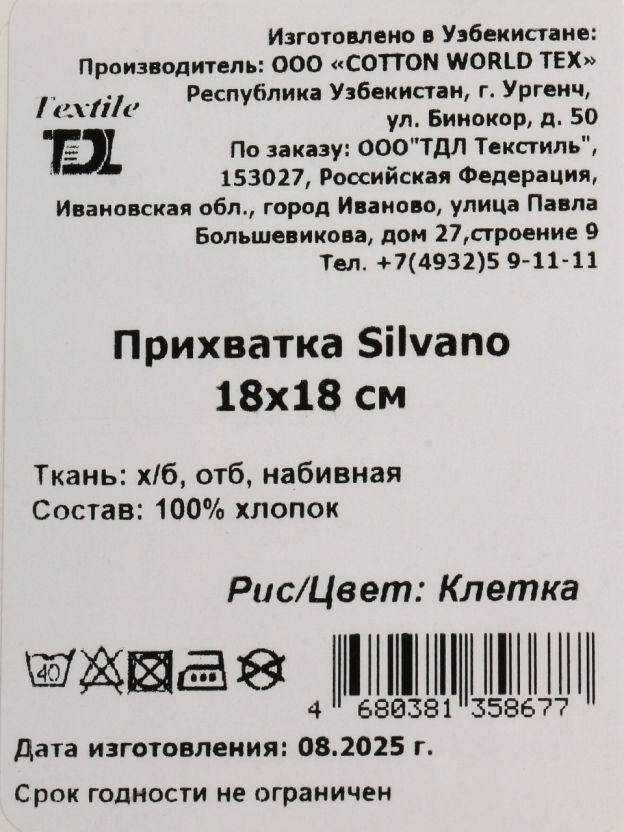 Размер прихватки — 18х18 см. Такой формат закрывает ладонь и часть запястья, обеспечивая защиту от горячих поверхностей и пара.
