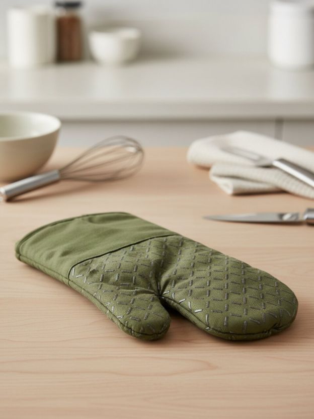Прихватка-варежка 32х15 см: безопасный захват горячей посуды, стильный зеленый акцент на кухне, долговечность и комфорт для дома и дачи.