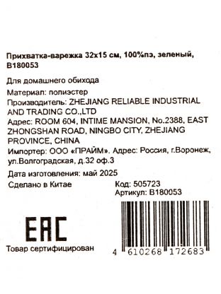 Добавьте прихватку-варежку 32х15 см в корзину — закажите прямо сейчас, чтобы получить качественный и стильный аксессуар для безопасной готовки по выгодной цене.