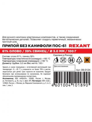 Припой без канифоли Sn61% Pb39%, Rexant, ПОС-61, 100 г, диаметр 3 мм, катушка, 09-3124