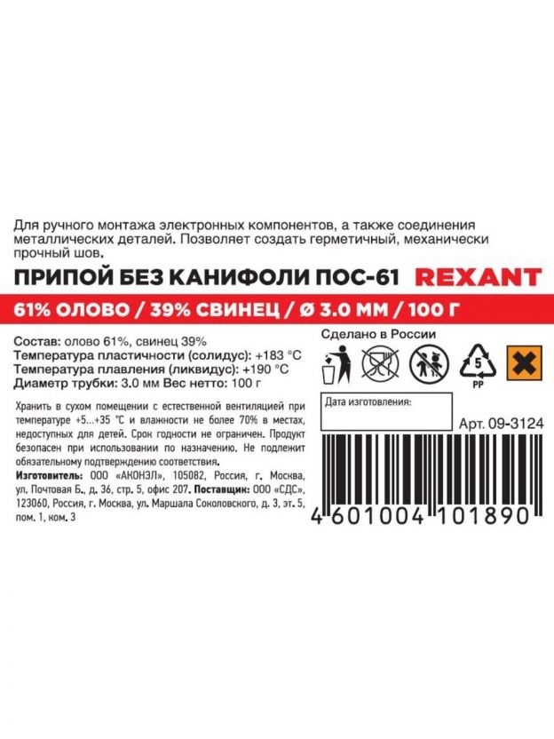Профессиональный припой без канифоли Sn61% Pb39%, ПОС-61 REXANT d3 мм, катушка 09-3124 — идеальный выбор для качественного и надежного соединения металлических деталей в домашних условиях и на даче. Продукт создан для тех, кто ценит удобство, чистоту и стабильный результат в процессе пайки. Благодаря оптимальному диаметру 3 мм и удобной катушке, обеспечивается простота использования и дозировки, что особенно важно при выполнении домашних ремонтов, пайке электропроводки, мелких бытовых работ и творческих проектов. Современный состав Sn61% Pb39% гарантирует высокую прочность соединения и стабильность результата, что особенно актуально при работе с электрикой и мелкой техникой. Припой без канифоли способствует более аккуратной пайке, снижая количество загрязнений и упрощая последующую обработку.