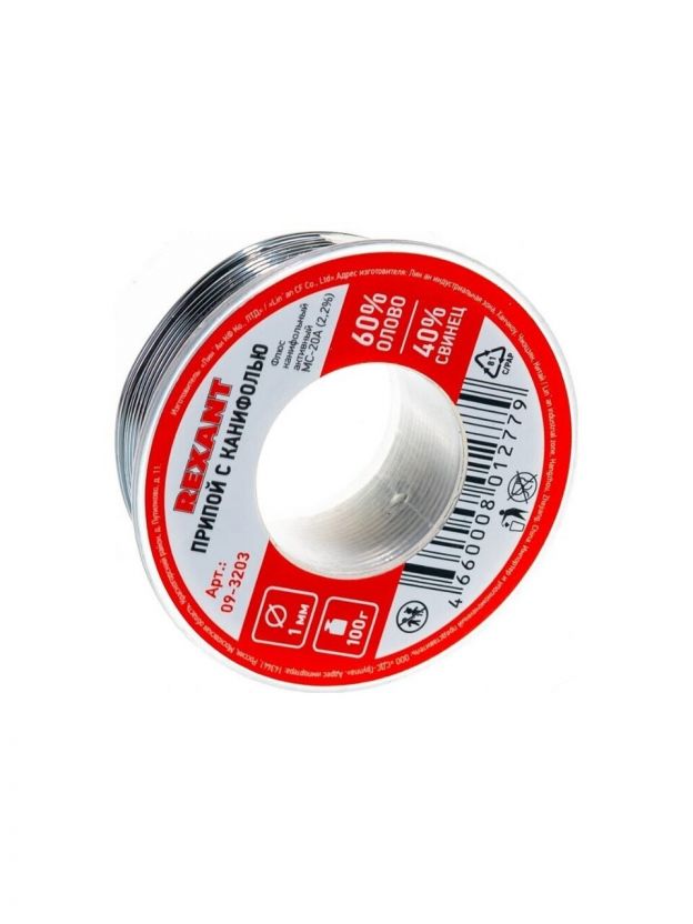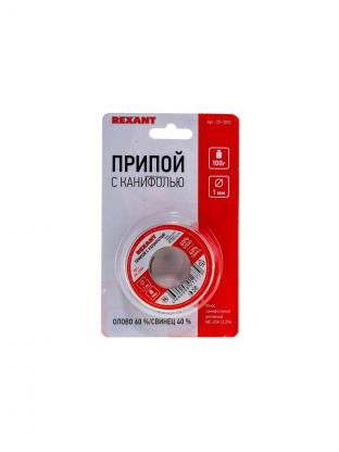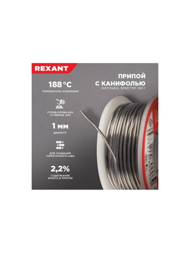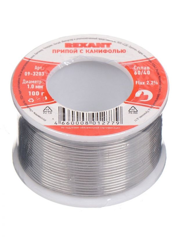 Припой с канифолью Sn60% Pb40% Flux 2.2%, Rexant, 100 г, диаметр 1 мм, катушка, 09-3203