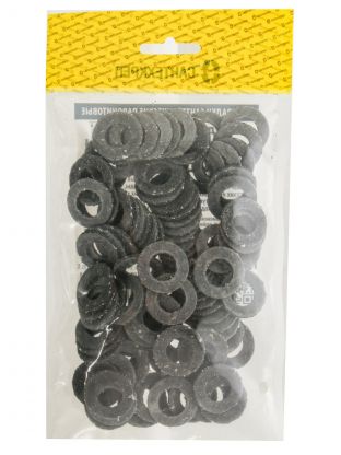В комплекте 100 прокладок, каждая размером 14х24 мм, диаметр подключения 3/4", цвет — серый, материал — паронит.