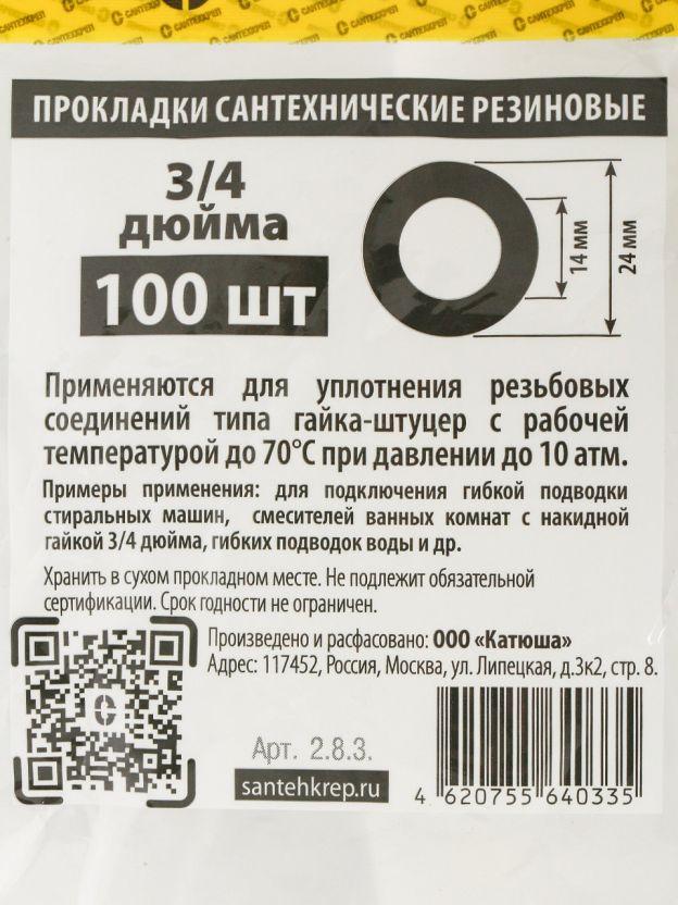 Прокладка уплотнительная 100 шт, 3/4", резина, СантехКреп, 2.8.3.Ф