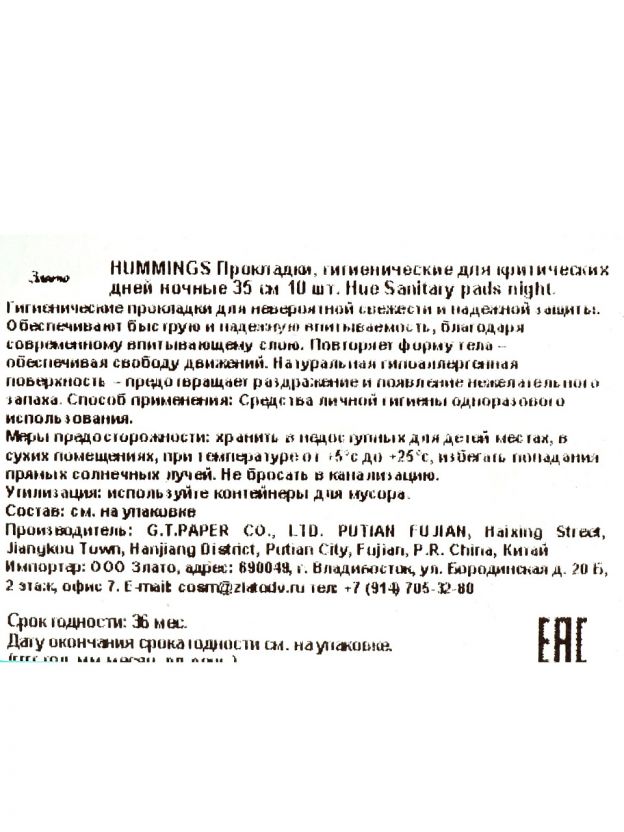 Прокладки женские Hummings, Hue Sanitary pads, ночные, 10 шт