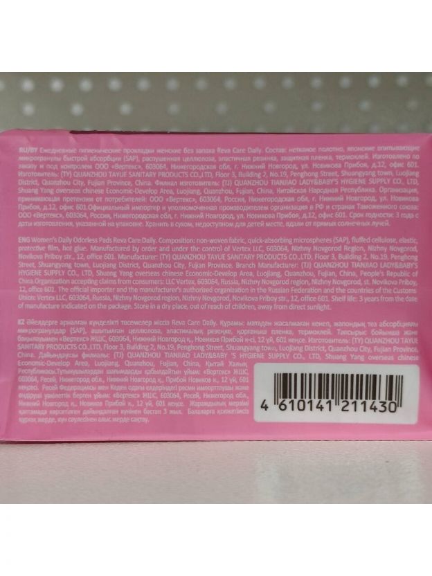 В каждой упаковке 30 ежедневных прокладок Reva Care Dailyt. Страна продавца — Китай.