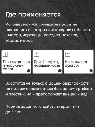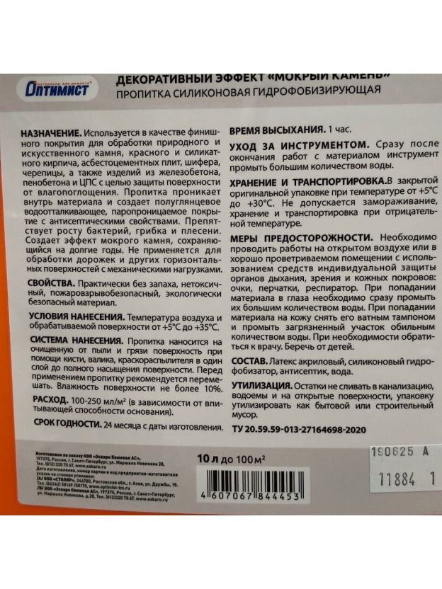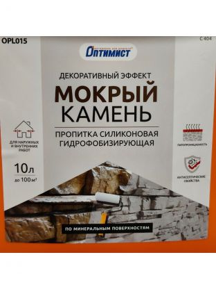 Пропитка Оптимист Мокрый камень используется в качестве финишного покрытия для обработки природного и искусственного камня, красного и силикатного кирпича, асбестоцементных плит, шифера, черепицы, а также изделий из железобетона, пенобетона и ЦПС с целью защиты поверхности от влагопоглощения.