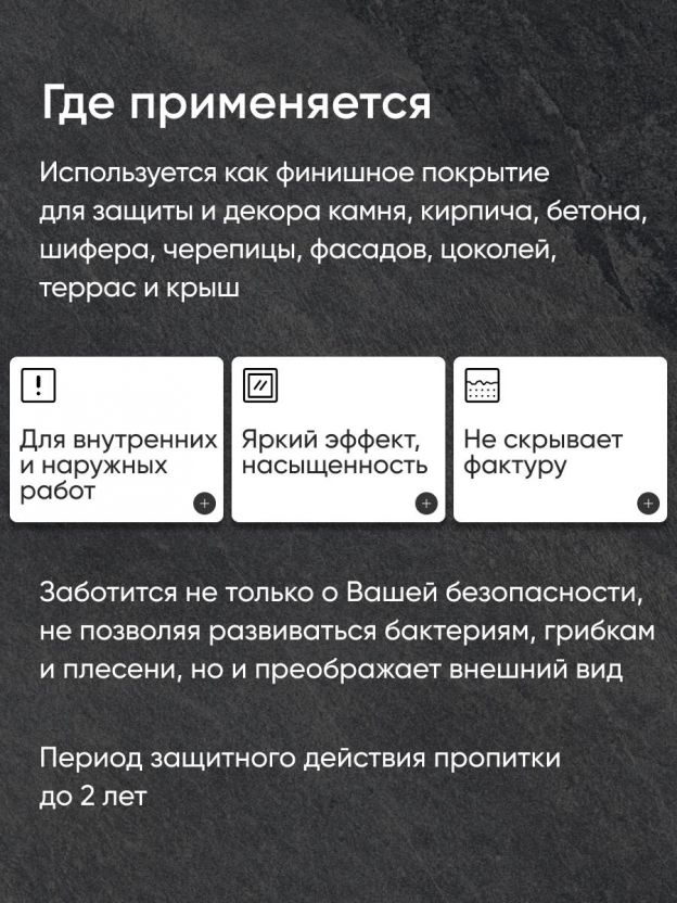- Область применения состава: для крыши, для металлочерепицы, для профнастила, для стен, для строительных работ, для террас, для торцов, для фасадов, для цоколей, по бетону, по камню, по кирпичу, универсальная.