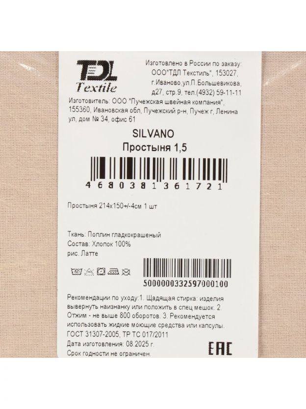 Размер простыни Silvano «Латте» — 150 х 214 см, что идеально подходит для стандартных 1,5-спальных матрасов без боковых свисаний и излишков ткани.