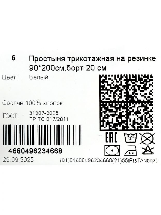 Простыня изготовлена из 100% хлопкового трикотажа — она мягкая, дышащая, гипоаллергенная, выдерживает частые стирки при температуре до 40°C и быстро сохнет без потери формы.
