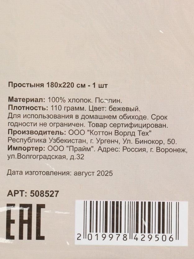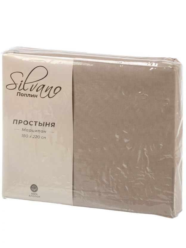 Простыня 2-спальная, 180 х 220 см, 100% хлопок, поплин, 110 г/м2, бежевая, Silvano, Узбекистан