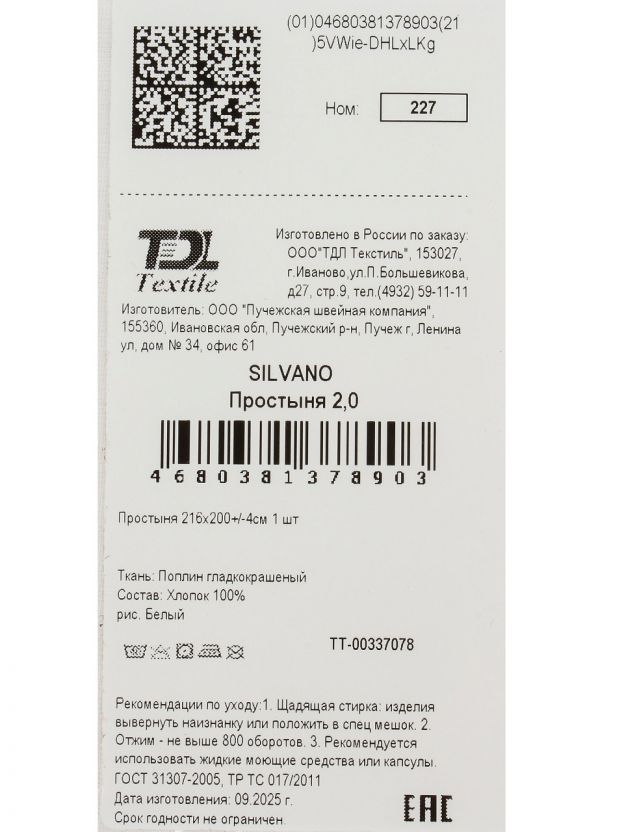 Простыня 2-спальная Silvano 216х200 см из 100% хлопка поплин — идеальное решение для комфортного сна, долговечности и стильного интерьера по доступной цене.