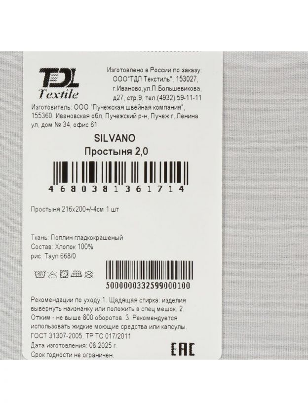 Простыня 2-спальная, 200 х 216 см, 100% хлопок, поплин, Silvano, Тауп