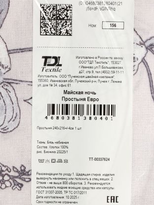 Простыня евро, 216 х 240 см, 100% хлопок, бязь, 120 г/м2, Майская ночь, 20225/1
