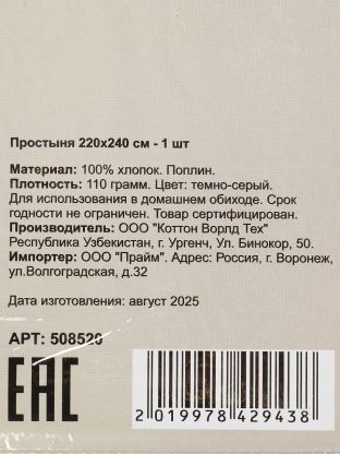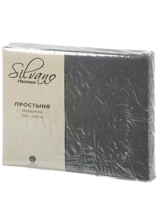 Простыня евро, 220 х 240 см, 100% хлопок, поплин, 110 г/м2, темно-серая, Silvano, Узбекистан