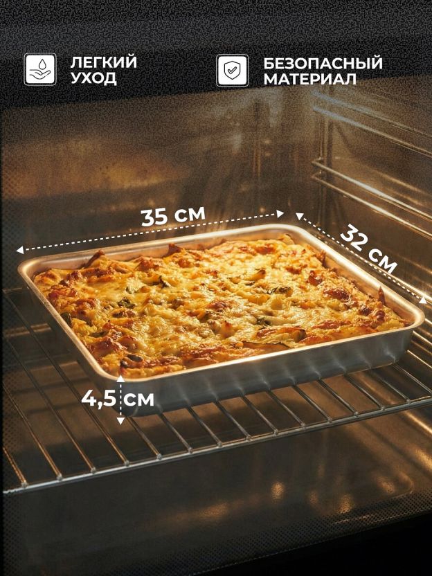 Ширина — 32 см, длина — 35 см, высота борта — 4,5 см, объём — 4 литра. Форма — прямоугольная, дно рифленое для лучшего пропекания.