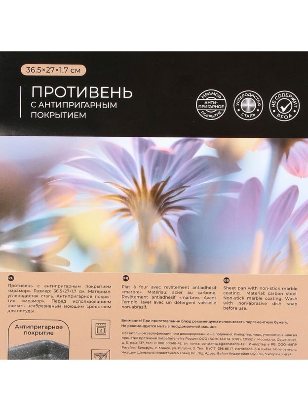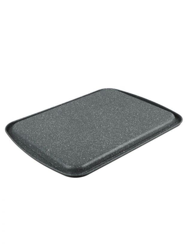 Размер противня — 36,5x27x1,7 см, крышка в комплект не входит. Противень неразъемный, с гладким дном, цвет — серый, коллекция Satoshi Буко.