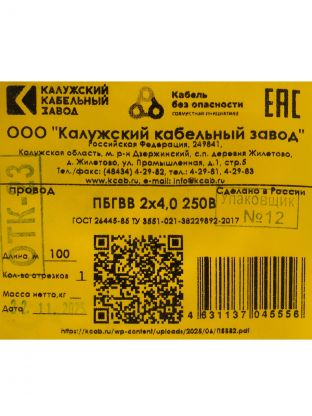 Одна бухта содержит 100 метров провода ПУГНП с двумя медными жилами по 4 мм2 каждая, что удобно для большинства стандартных проектов электромонтажа.