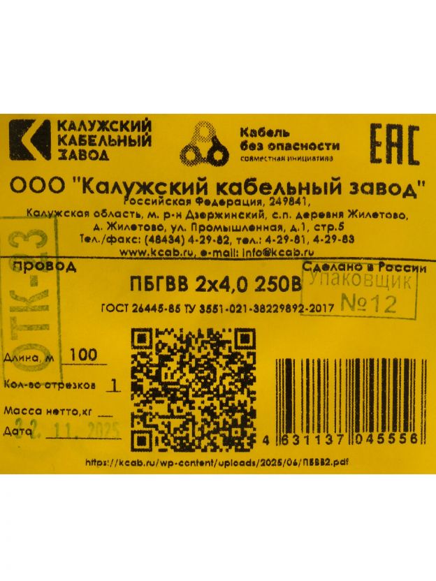 Провод ПУГНП 2х4 мм2, 100 м от бренда ККЗ — это выбор профессионалов и домашних мастеров, когда требуется купить недорого провод для дачи или квартиры с гарантией соответствия ГОСТ. Две медные жилы сечением 4 мм2 обеспечивают высокую проводимость и минимальные потери тока, что особенно важно при подключении мощных приборов и освещения. Благодаря белой изоляции провод гармонично вписывается в современный интерьер, а длины 100 метров достаточно для большинства проектов электропроводки.