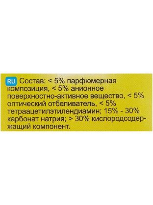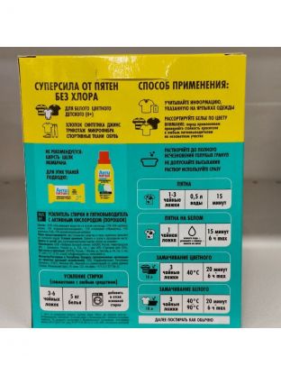 Порошок-пятновыводитель с OXI-формулой удаляет трудновыводимые пятна и обеспечивает ослепительную белизну за счёт высокого содержания активного кислорода. Наличие в гранулах TAED-компонента, необходимого для активизации кислорода при низких температурах, обеспечивает эффективное действие уже при температуре 40 °С. Усиливает действие стирального порошка. Без хлора, не вызывает раздражений. Не разрушает структуру и цвет ткани. Подходит для всех видов тканей, белых и цветных. Для ручной и машинной стирки. Может использоваться для выведения локальных пятен, при замачивании, а также в качестве усилителя стирального порошка.