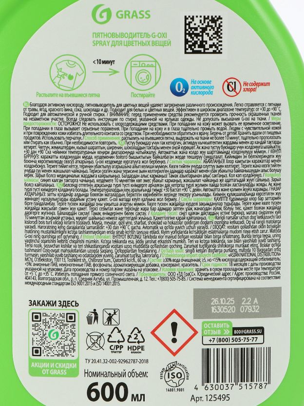 Пятновыводитель Grass, G-oxi spray, 600 мл, жидкость, для цветного, кислородный, 125495