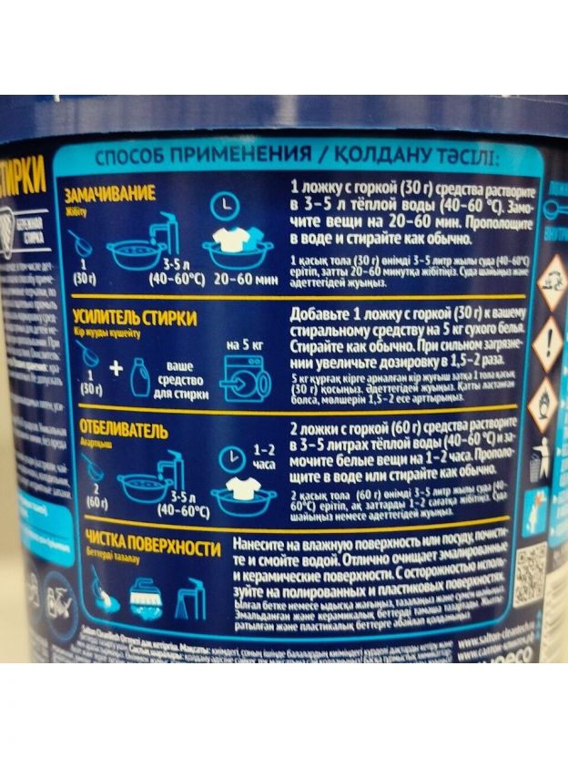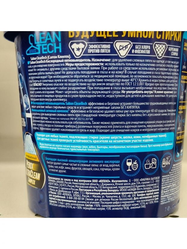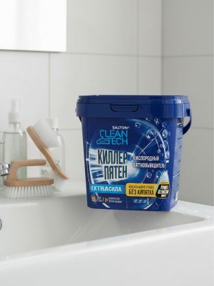 Универсальный кислородный пятновыводитель нового поколения Salton CleanTech с легкостью решает сразу несколько проблем. Этот уникальный чистящий порошок от пятен действует в десяти направлениях: эффективно и бережно устраняет большинство трудновыводимых пятен, отбеливает, освежает белье, безопасен для стирки детской одежды, для белых и цветных тканей, без хлора, SLS и фосфатов, нейтрализует неприятные запахи, а также усиливает действие любых других стиральных средств, легко очищает поверхности, удаляет жир.