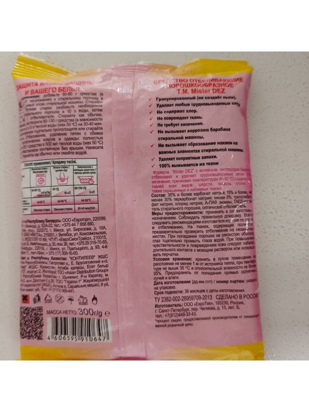 Пятновыводитель-отбеливатель Mister Dez, Eco-Cleaning, 300 г, порошок, для белья, кислородный