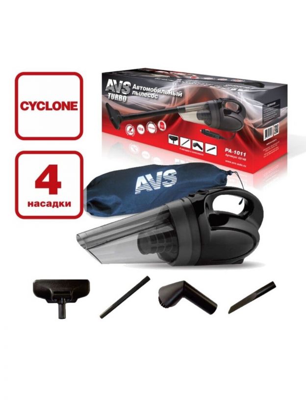 Пылесос автомобильный AVS, PA-1011, 150 Вт, 12 В, сухая уборка, 4 насадки, циклон, черный