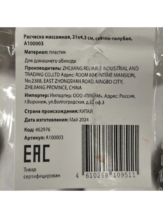 Расческа массажная, 21х4.3 см, светло-голубая, A100003