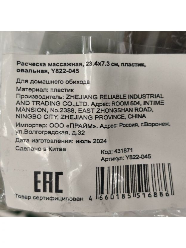 Расческа массажная, 23.4х7.3 см, пластик, овальная, Y822-045