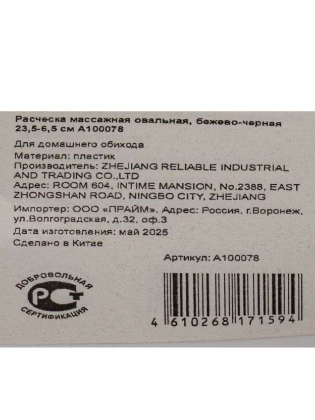 Расческа массажная, 23.5х6.5 см, пластик, пластиковая ручка, овальная, бежево-черная, A100078