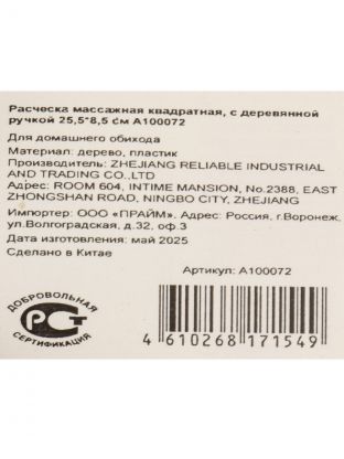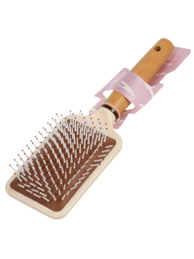 Расческа массажная, 25.5х8.5 см, пластик, деревянная ручка, квадратная, A100072
