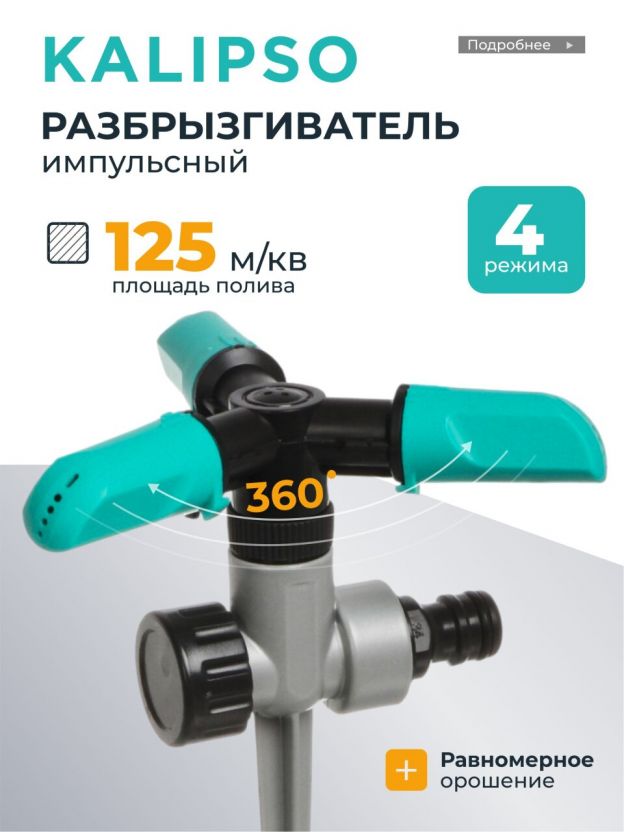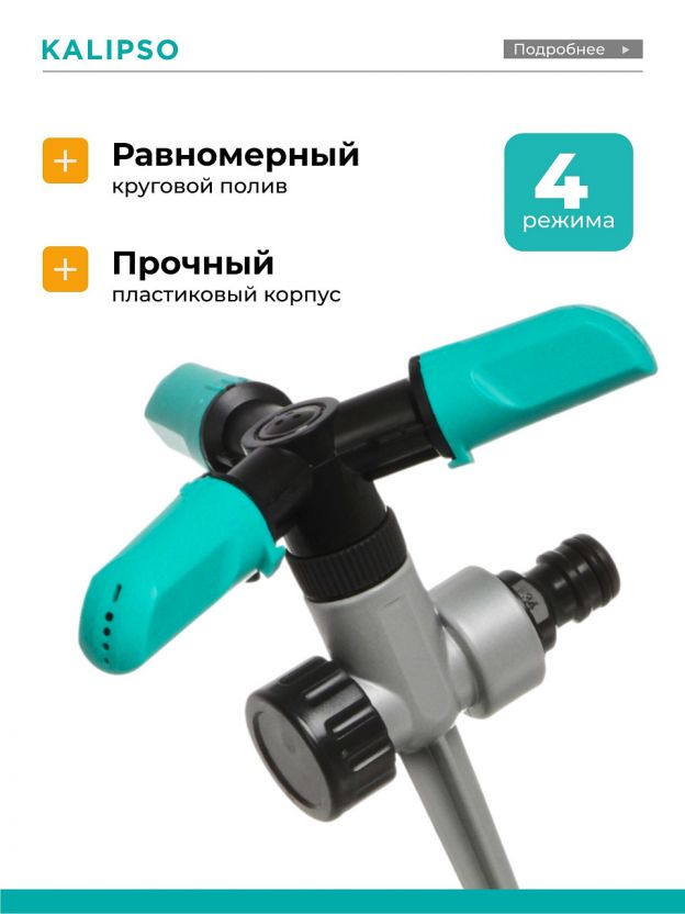 Разбрызгиватель 4 режима Kalipso DY1014Z — идеальное решение для эффективного полива газона или огорода. Современная роторная конструкция с тремя лепестками и цинковым наконечником обеспечивает равномерное орошение участка площадью до 125 м2. Импульсный механизм, регулировка давления и выбор одного из четырех режимов позволяют легко адаптировать полив под любые задачи. Быстросъемное соединение экономит время на установку, а прочный пластик гарантирует долговечность.
