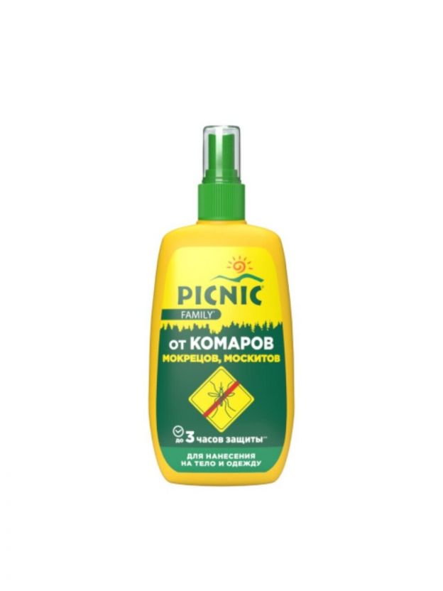 Репеллент от комаров Picnic Family — эффективная защита для взрослых и детей от комаров, мокрецов и москитов. Спрей удобен для использования на улице и в помещении, подходит для семейного отдыха и прогулок. Объем 120 мл обеспечивает длительное применение, безопасен для кожи, быстро впитывается и не оставляет следов. Идеальный выбор для комфортного отдыха без насекомых и раздражения.