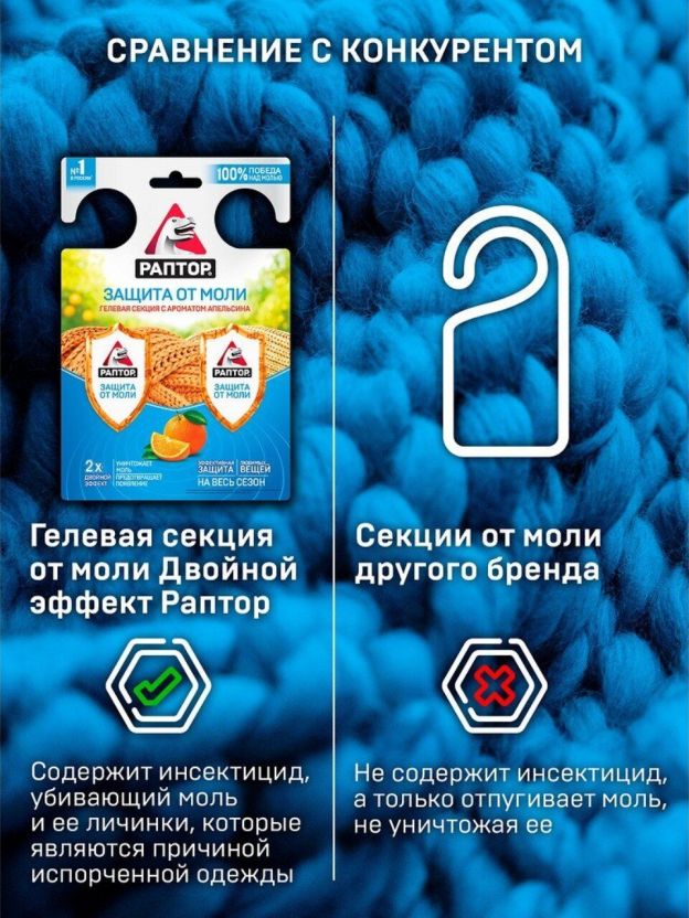 Репеллент от моли, гелевая секция с ароматом апельсина Раптор Двойной эффект RPT0005 — надежное решение для защиты одежды и текстиля от моли в домашних условиях. Эффективно уничтожает насекомых, придавая свежий апельсиновый аромат помещению. Компактная гелевая секция проста в использовании и безопасна для окружающих. Отличный выбор для поддержания чистоты и уюта в шкафах и гардеробных.