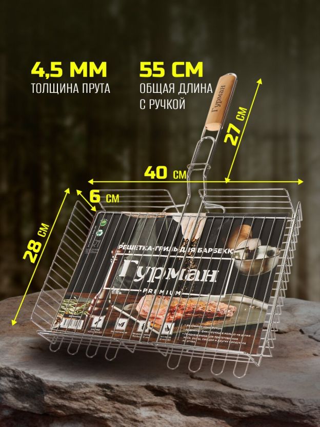 Решетка барбекю 400х280х60 мм Гурман Люкс: сталь, хром, дерево — идеальный выбор для дачи, пикника и подарка ценителям гриля.