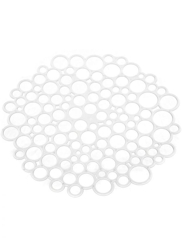 Коврик для раковины изготовлен из пластика. Изделие одновременно выполняет несколько функций: украшает, предотвращает появление на раковине царапин и сколов, защищает посуду от повреждений при падении в раковину, удерживает мусор, попадание которого в слив приводит к засорам. Изделие также обладает противоскользящим эффектом и может использоваться в качестве подставки для сушки чистой посуды. Легко очищается от грязи и жира.