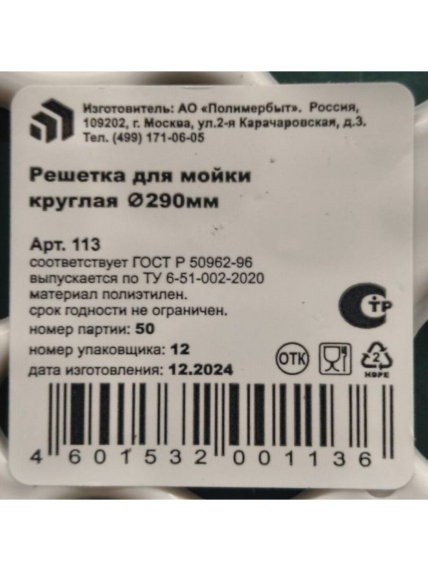 Решетка для мойки 29 х 29 см, пластик, круглые, d 29 см, Полимербыт, С113, в ассортименте