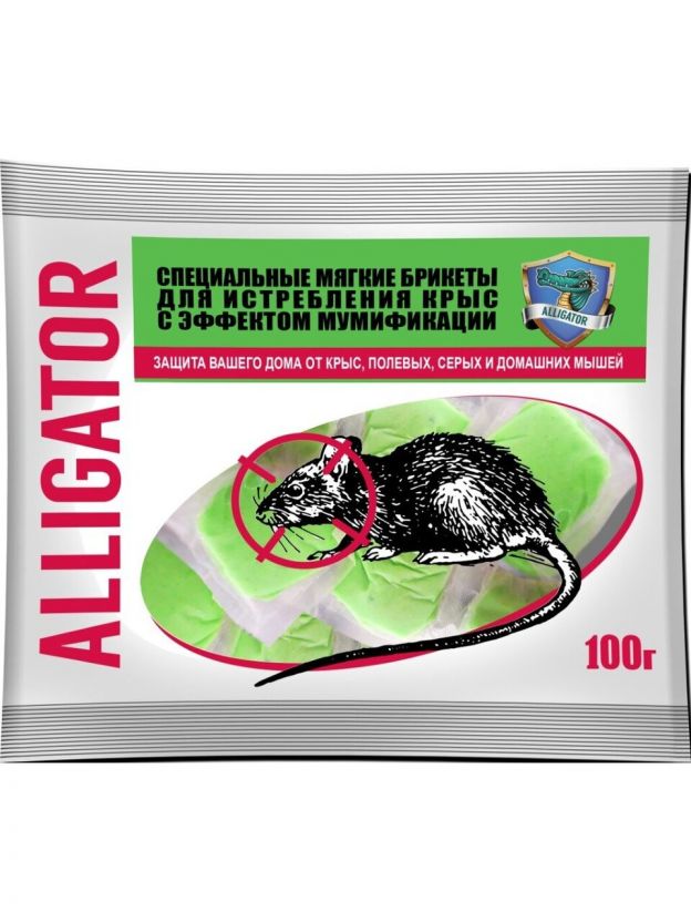 Аллигатор – специальные мягкие брикеты, окрашенные в яркий цвет с эффектом мумификации. Применяется для истребления всех видов мышей, а также крыс и других грызунов. Приманка содержит горькую добавку «битрекс», предотвращающую случайное съедение приманки человеком или домашними животными (кроме грызунов). В качестве действующего вещества используется – бромадиолон. Бромадиолон – это родентицид, из класса антикоагулянтов. Имеет отсроченный срок действия. Вещество, попадая в организм грызуна, замедляет синтез протромбина в печени. Это приводит к снижению свертываемости крови и истончению стенок кровеносных сосудов.