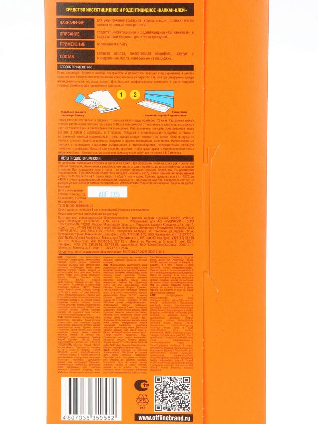 В упаковке 2 клеевые ловушки бренда Грызунофф Оффлайн, артикул GR10370041, страна продавца — Россия. Форма выпуска — клеевая пластина с активным клеевым слоем.
