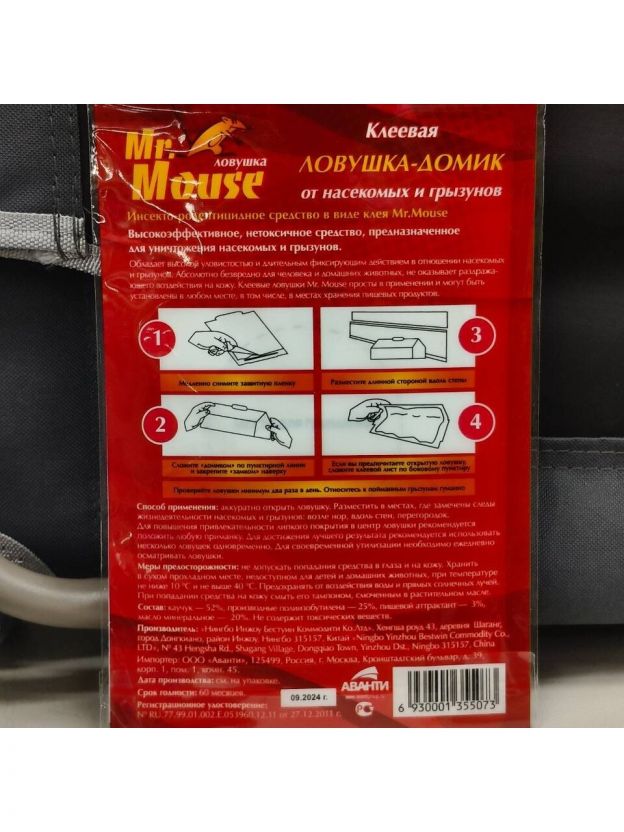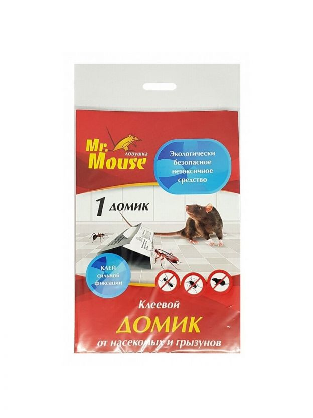 Mr.Mouse клеевая ловушка - Домик от грызунов 1 штучный (в пакете) - это высокоэффективное, нетоксичное средство предназначено для уничтожения грызунов. Обладает высокой уловистостью и длительным фиксирующим действием в отношении грызунов. Абсолютно безвредно для человека и домашних животных, не оказывает раздражающего воздействия на кожу. Клеевые ловушки Mr.Mouse просты в применении и могут быть установлены в любом месте, в том числе и в местах хранения пищевых продуктов.