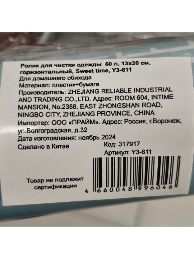 Ролик для чистки одежды 60 листов, 13х20 см, горизонтальный, Sweet time, Y3-611