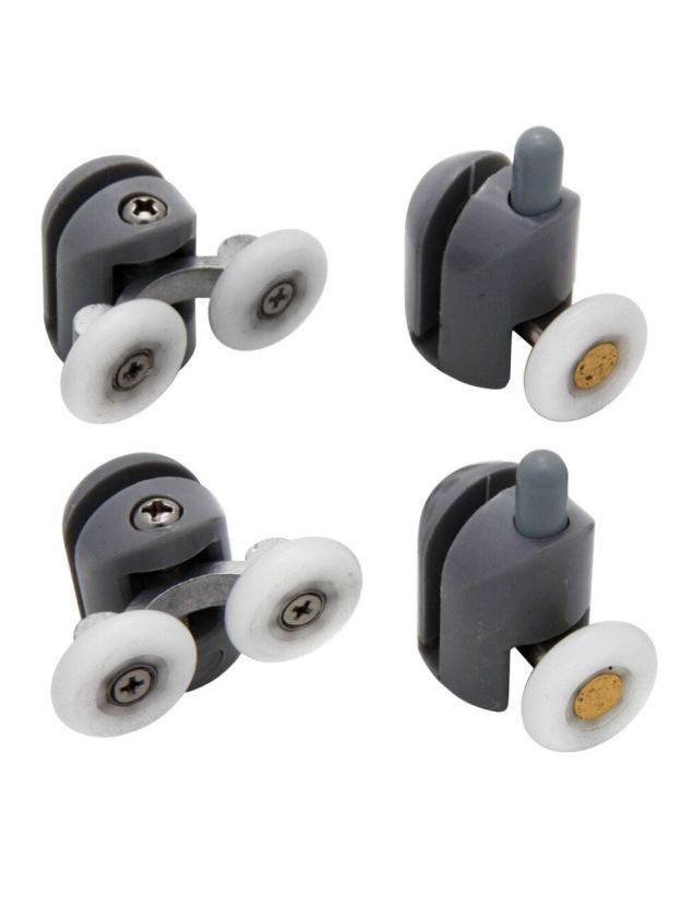 Комплект двойных сменных натяжных роликов с регулировочным винтом по высоте и два одинарных подпружиненных нижних роликов для душевой кабины.